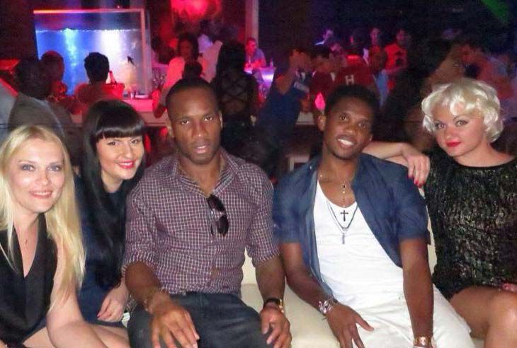 Sur cette image on voit bien Didier Drogba et Eto o Fils entourés de belles nanas. C était à la faveur d un « bivouac » que les deux footeux se sont permis, il y a juste une poignée de semaines. Constat : la table bien garnie de nos noceurs d un soir présente une configuration spéciale. Remarquez que tout le monde a devant lui son verre, sauf Eto o. Pourquoi ?