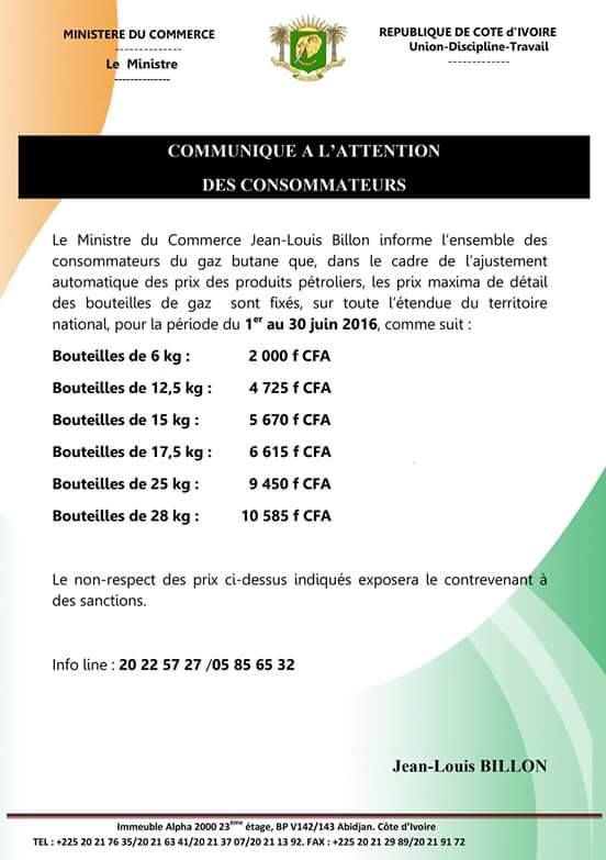 Le Ministre du Commerce Jean-Louis Billon informe l ensemble des consommateurs du gaz butane que, dans le cadre de l ajustement automatique des prix des produits pétroliers, les prix maxima de détail des bouteilles de gaz sont fixés, sur toute l étendue du territoire national, pour la période du 1er au 30 juin 2016, comme suit :