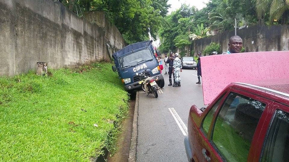 Un cargo de la police vient de tomber dans un caniveau aux environs de la clinique de l'indenié. Le cargos transportait une vingtaine de policiers venait de quitter la préfecture de police. Il transportait des agents en mission pour Attingué en de sécuriser une cérémonie .