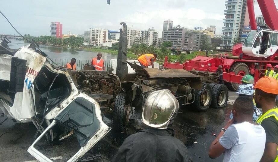 Une partie du camion d'ordures plongee dans la lagune est sortie de l'eau. Ce qui reste du camion d'ordures est sur le point d'être transporté par un camion de dépannage pour acheminée. L'opération n'est pas terminée. Le coffre du véhicule encore dans le fond de la lagune.