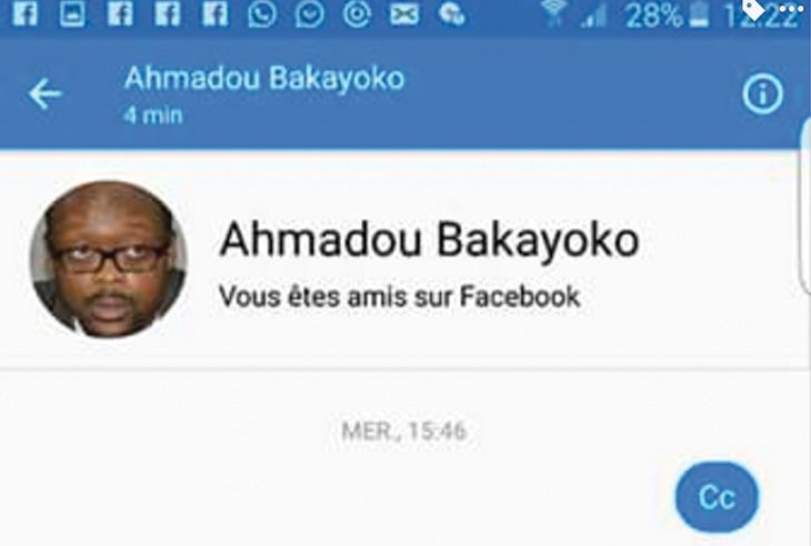Un individu mal intentionné s'adonne à une pratique très courante ces derniers temps sur les réseaux sociaux. Mais celui qui vient d'être "épinglé", lui a choisi de se cacher derrière l'image du DG de la RTI, M. Amadou Bakayoko, pour le faire. Il vient s'être démasqué par le bloggueur Matt Le Blanc, bien connu dans le milieu du showbiz ivoirien, sur Facebook. L'anarqueur a tenté d'escroquer la somme de 350 000 francs à ce dernier qui l'a très vite démasqué. Alors vigilance sur les réseaux sociaux car on ne sait pas qui se cache véritablement derrière l'image même des personnes que vous êtes êtes sensées connaître.