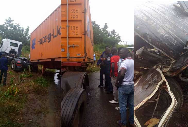 Ce jeudi 7 juillet 2016, il s est produit un grave accident de circulation sur l'axe Abidjan-Aboisso. En effet, un camion remorque et un véhicule de type kia sont entrés en collision a 15 kilomètres de la ville d Aboisso. L on décompte deux morts dont le chauffeur et l apprenti du véhicule de type kia. Aussitôt alertée, la Gendarmerie d Aboisso s est dépêchée sur les lieux de l accident pour le constat suivi d un corbiard pour le retrait des corps.