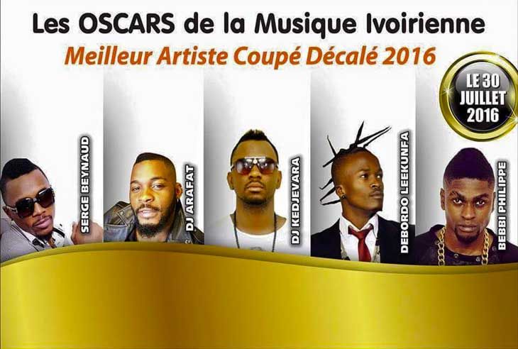 On s active pour les oscars de la musique ivoirienne Le samedi 30 juillet prochain au Palais de la culture de Treichville, se tiendra la première édition des Oscars de la musique Ivoirienne (OMI). Cette cérémonie a pour objectif de distinguer les meilleurs artistes qui se sont illustrés de belles manières avec leurs différentes productions au cours de l année 2016. Et déjà, on s active dans les différentes catégories. Et comme d habitude, la catégorie qui s illustre de fort belle manière sur les réseaux sociaux, c est le coupé-décalé. Serges Beynaud, le mannequin des arrangeurs, Arafat DJ, le roi des Yorogang, Kédjévara DJ, Bebi Filip et Debordo DJ figurent parmi les nominés de la catégorie coupé-décalé.