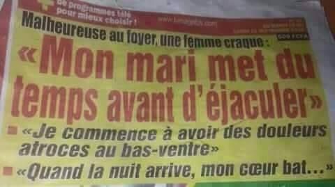 Éjaculation précoce. Certaines femmes s'en plaignent. D'autres vivent d'autres réalités. Disons calvaire. Telle cette dame qui est allée se plaindre au Cameroun à un journal. "Mon mari met du temps avant d'éjaculer. " Elle en souffre la bonne dame. "Je commence à avoir des douleurs atroces au bas ventre". Conséquence, elle est traumatisée. "Quand la nuit arrive, mon coeur bat". Yako à elle. Elle fait quoi selon vous ?